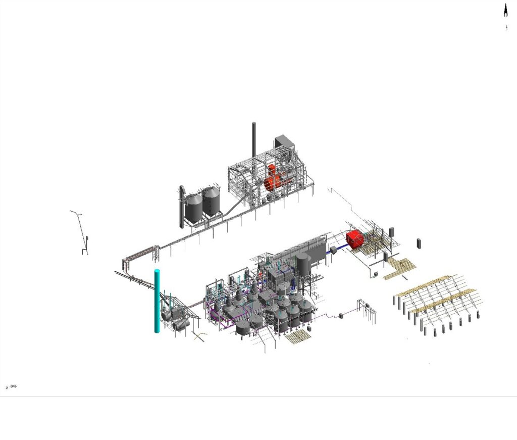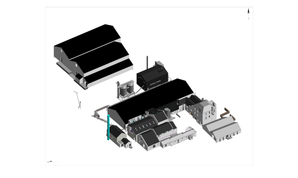 Across the site, the model shows a mix of different Entity types: large industrial buildings, smaller ancillary structures, and more specialised spaces such as plant rooms or dedicated process areas.